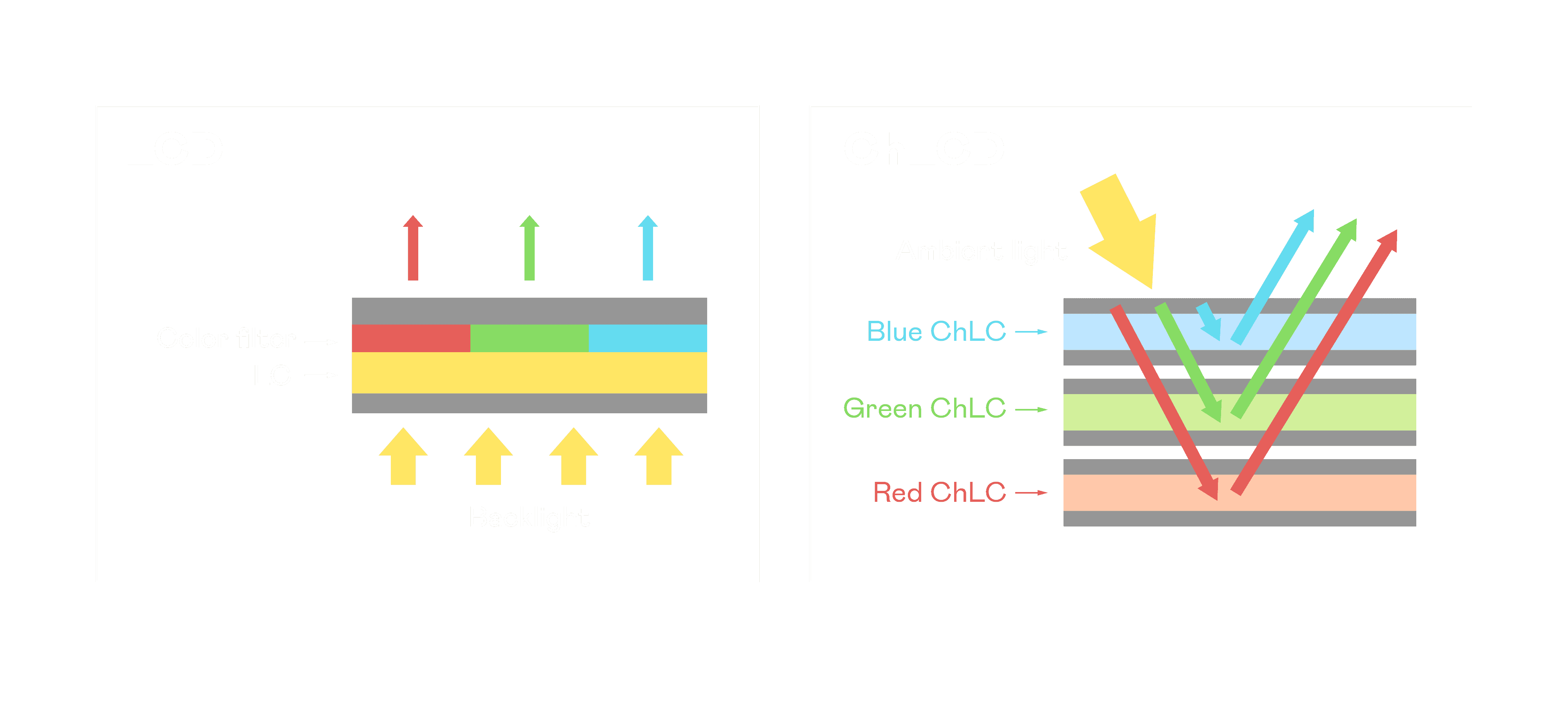 ChLCD 胆固醇液晶就如同纸张一样,,,透过反射环境光来显示影像,,,因此长时间观看不易造成人眼视觉疲劳,,,,可达到护眼效果。。。当处于户外阳光下使用,,LCD 影像容易失真而不易观看,,但胆固醇液晶仍可维持较佳的影像品质。。