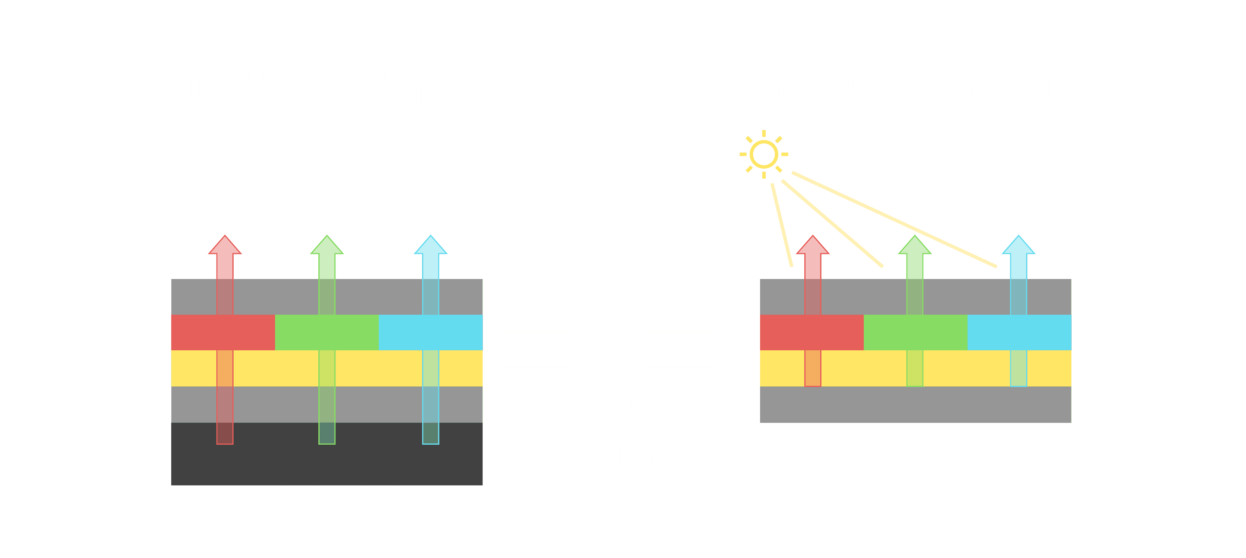 与传统需搭配背光单元的液晶显示相比,,,反射式液晶技术不仅更省电、、、更轻薄,,且即便在艳阳下仍能清晰显示。。。。此外,,,少了背光单元,,也大幅降低了 LED 蓝光伤害眼睛的疑虑。。