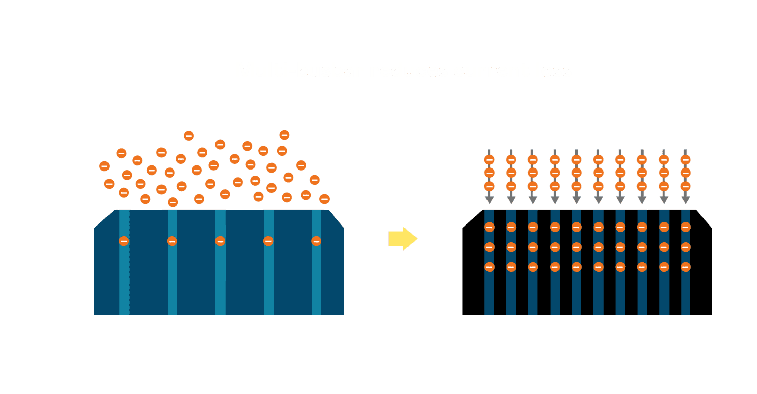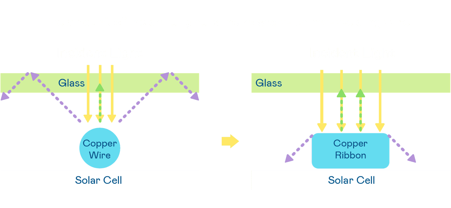 - 电池使用多条铜导线 (Copper wire) 于电池片上形成较短的电流路径,,,,提高电流收集效率,,,采用圆形设计的铜导线较传统扁平式的铜焊带 (Ribbon),,可增加入射至电池的光线量。。。