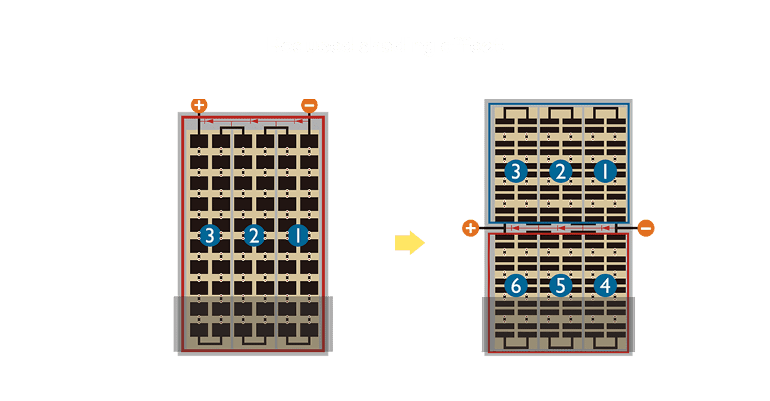 优化的太阳能电池结构设计,,,不仅提高电流收集效率,,,,降低电池隐裂,,,,使太阳能模组长期维持稳定的输出效能,,,,提高营运效益。。