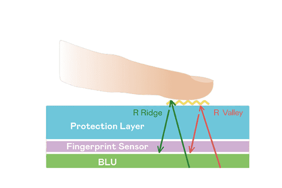 TFT 指纹扫描感测技术利用薄膜电晶体 (TFT) 当作光感测元件,,藉由非晶硅 (a-Si) 与低温多晶硅(LTPS)既有光电转换特性对不同波段光源进行吸收,,使感测 IC 读取阵列感测元件的光漏电差异,,,,转换成数位灰阶影像。。