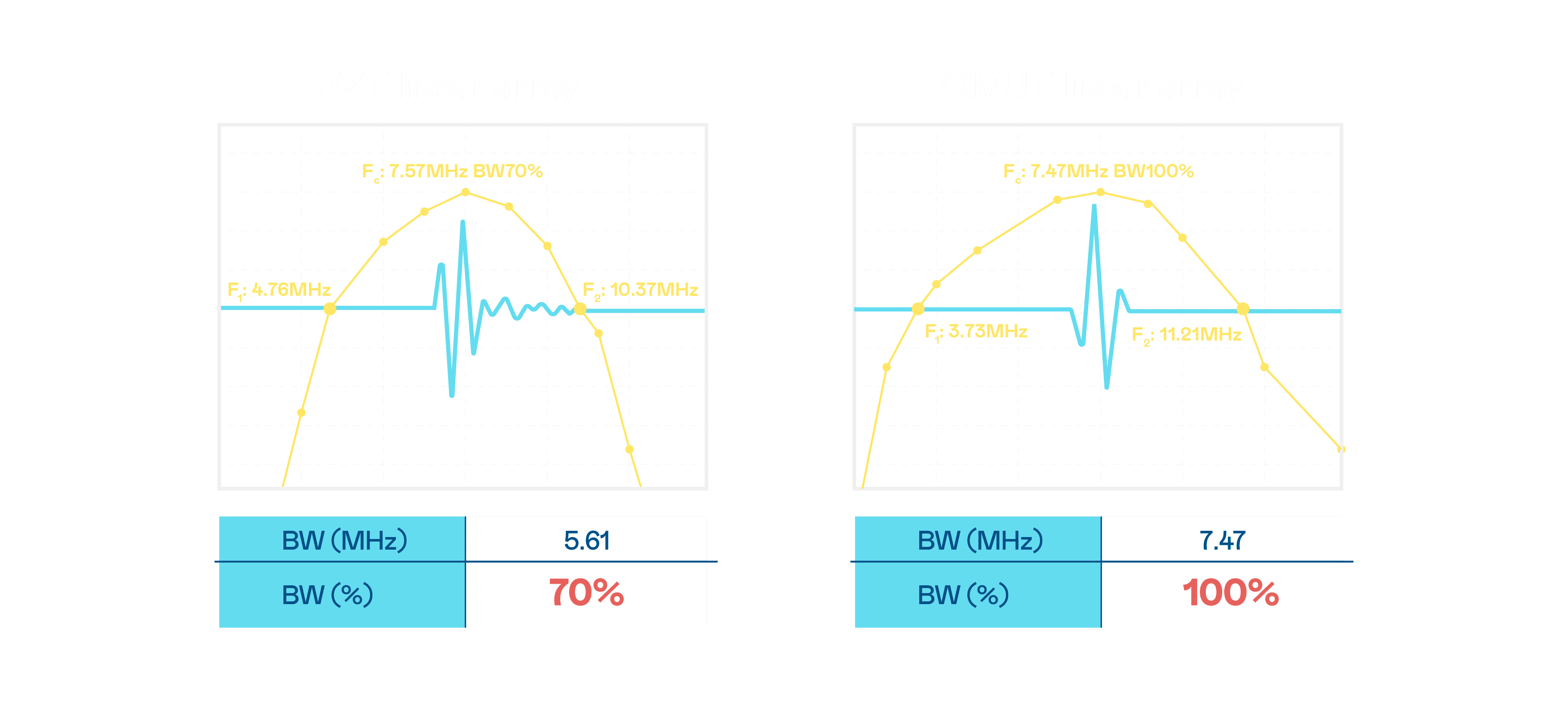 超音波影像的解析度高低,,,首先取决于探头能发出的讯号频宽。。。z6mg·人生就是博 CMUT 可提供高清晰的超音波讯号,,提供高频宽、、高灵敏度、、、影像纹理细节更高的超音波影像,,,,协助医护人员缩短影像判读时间及利用精准的医疗影像进行诊断。。